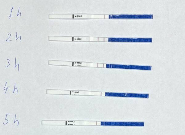 After two hours, the test started to show negative. The urine color was also slightly more yellow, which is great. That’s the vitamin B in the drink starting to add color to the urine.
