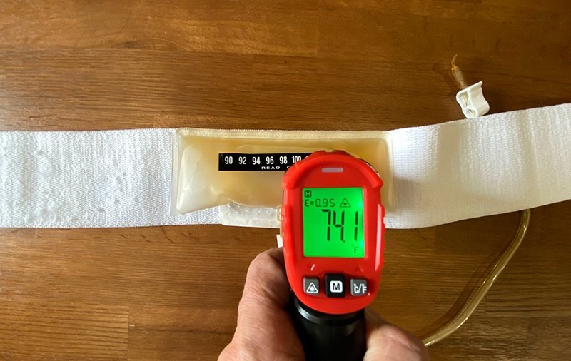 I’m going to check how quickly the heat pad warms the urine and how reliable the temperature strip on the urine bag is. I used an infrared thermometer for accuracy.